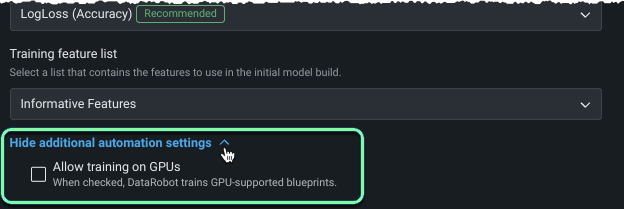 For datasets that include text and/or images and require deep learning models, you can select to train on GPUs to speed up training time. While some of these models can be run on CPUs, others require GPUs to achieve reasonable response time. When Allow training on GPUs is selected, DataRobot detects blueprints that contain certain tasks and includes GPU-supported blueprints in the Autopilot run. Both GPU and CPU variants are available in the repository, allowing a choice of which worker type to train on; GPU variant blueprints are optimized to train faster on GPU workers. Notes about working with GPUs: