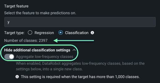 Changing the target type enables the multiclass configuration options. If there are more than 1000 numeric values (classes) for the target, the Aggregate low-frequency classes option, described below, is enabled by default.