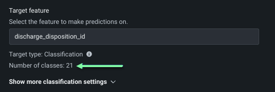 For multiclass or multilabel classification experiments, click Show more classification settings to further configure modeling settings.