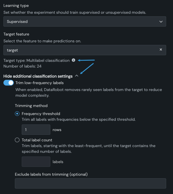 | Total label count | Sets the final number of labels allowed after trimming. When set, DataRobot trims labels, starting with the least frequent, until the target contains the specified number of labels. Enter a value between 2-1,000. |