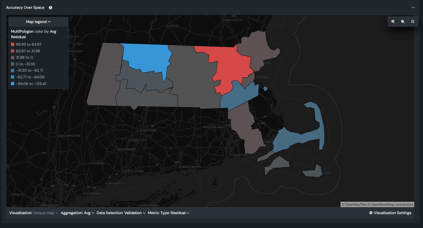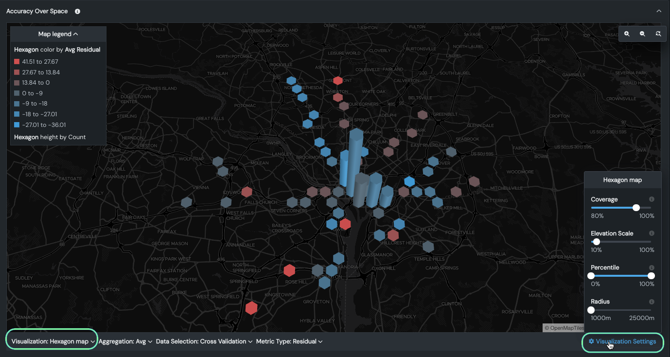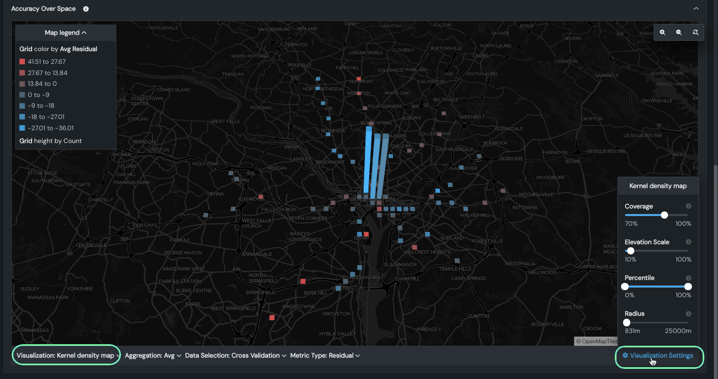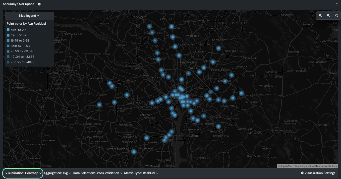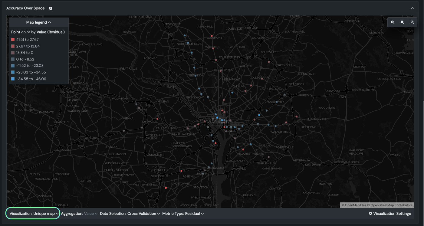 By default, Accuracy Over Space displays residual (prediction error) values on a unique map based on the validation partition. Co-located points are displayed using the average value of all points at that location. The map type and visualization settings can be adjusted to further fine-tune the display. The collapsible map legend updates as you change the settings. The following table describes the settings: