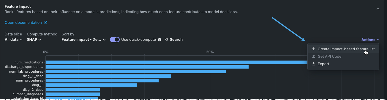 You can export Feature Impact data or create a feature list based on the relative impact of features. To create a feature list, choose + Create impact-based feature lists from the Actions dropdown.