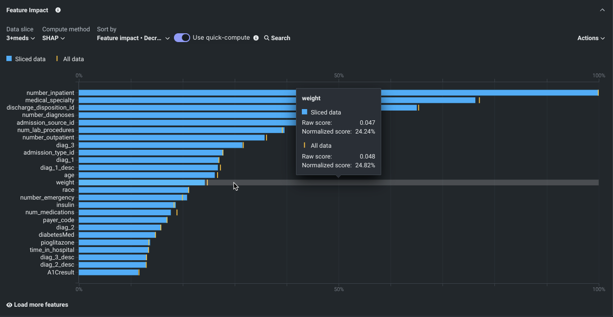 Use the segment-based accuracy information gleaned from sliced insights, or compare the segments to the "global" slice (all data), to improve training data. Initially, each feature shows a blue bar that indicates the importance to the target, calculated on all the data used to train the model. If you select or create a new slice, you must first recompute the insight to reflect just the values from the identified subpopulation. Then, the chart updates to show the same top 25 features (or more, if loaded). Now, the blue bar represents the subpopulation's importance to the target. A yellow marker allows you to compare the value in the context of all the data. Hover on a feature for more detail.