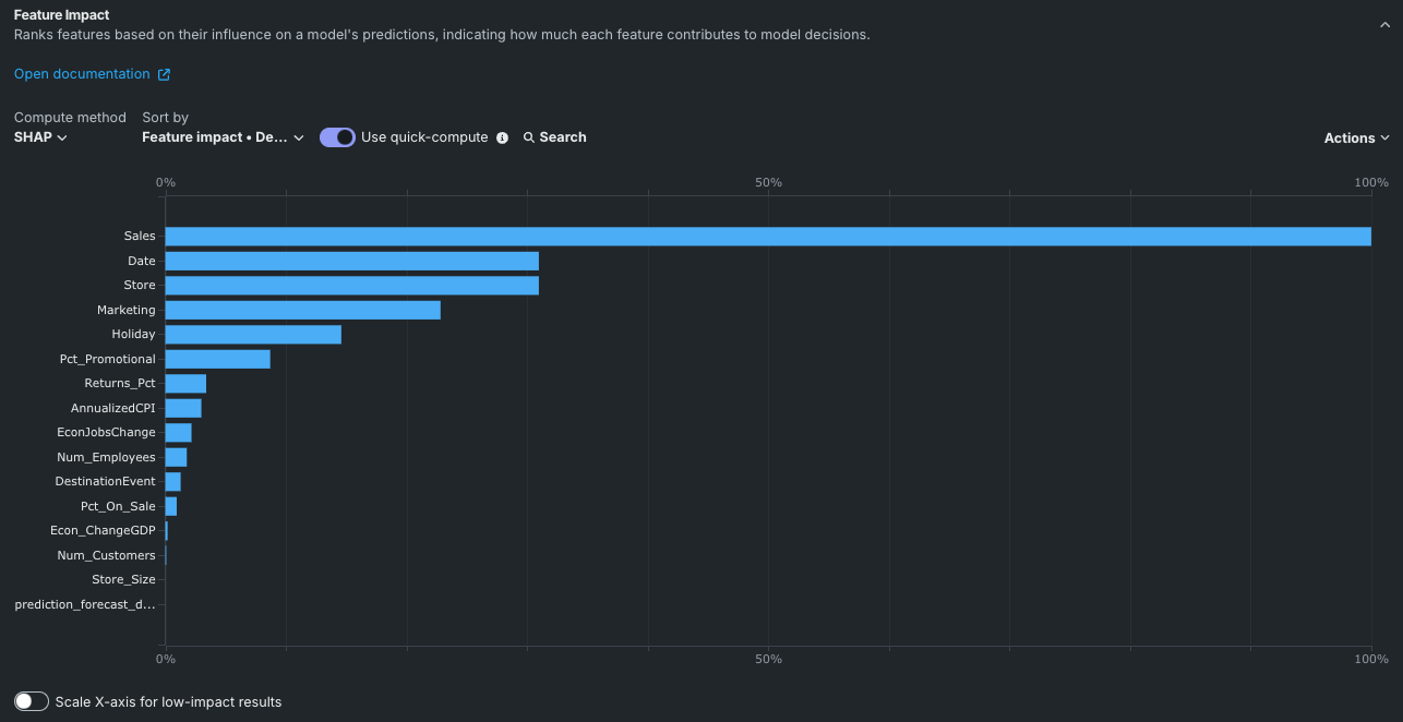 When working with Feature Impact, the Use quick-compute option controls the sample size used in the visualization. The row count used to build the visualization is based on the toggle setting and whether a data slice is applied.