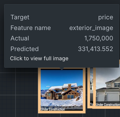 Hover on an image to see details, including the actual and predicted class information. Use these tooltips to compare images to see whether DataRobot is grouping images as you would expect: