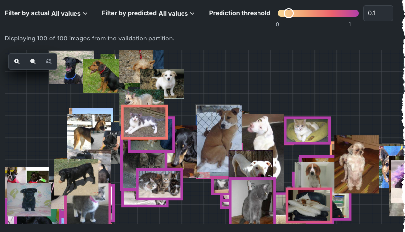 Images with a predicted probability below the threshold don't have any border and can also be filtered out to disappear from the canvas entirely. In clustering projects, the frame of each image displays in a color that represents the cluster containing the image. Hover over an image to view the probability of the image belonging to each cluster.