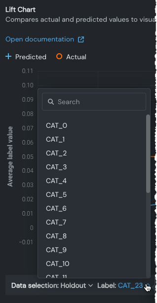 5 Label and data selectors Sets the data partition—validation, cross validation, or holdout (if unlocked)—to report per-label values for. Display all or only pinned (selected) labels.