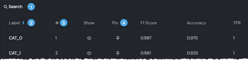 The ID column (#) is static and allows you to assess, together with sorting, the labels for which the metric of interest is above or below a given value.