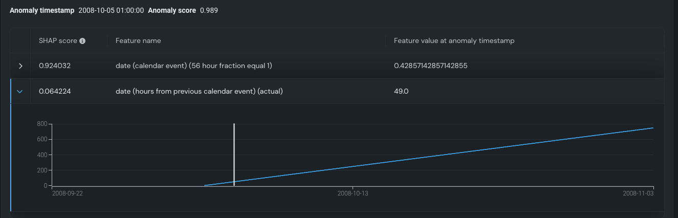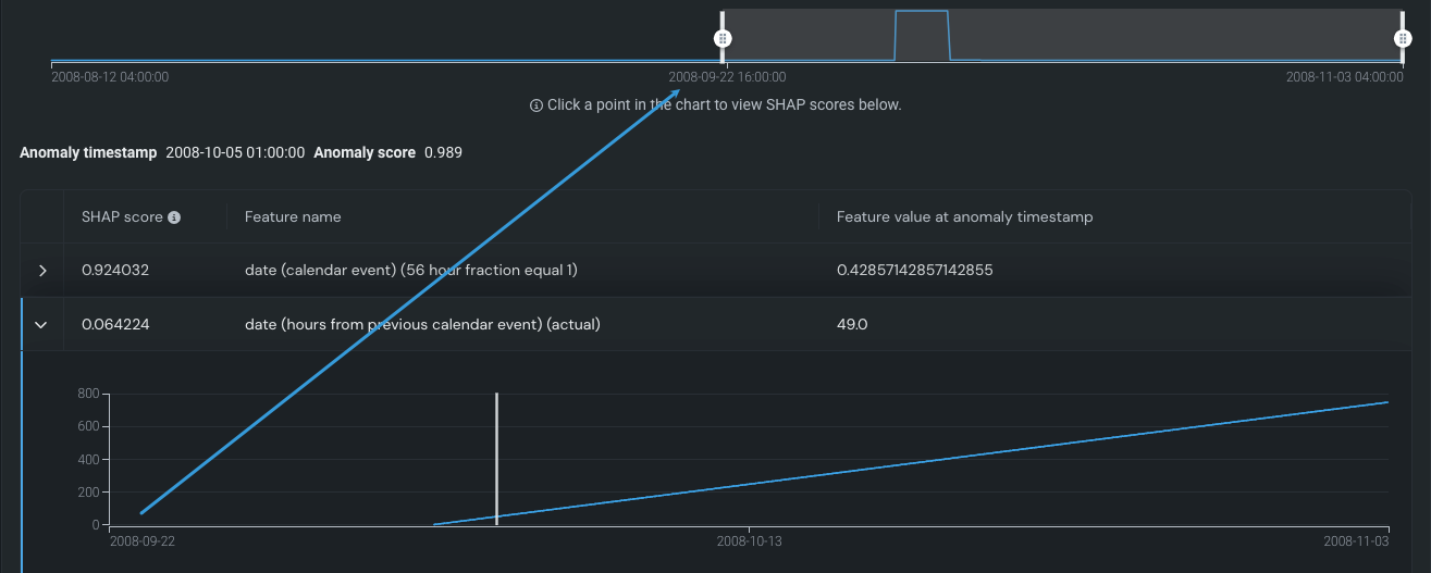As you click through the chart, notice that the list of explanations (scores) changes. If a point is not anomalous, no SHAP scores are listed. Expand a score to see the value charted over time.
