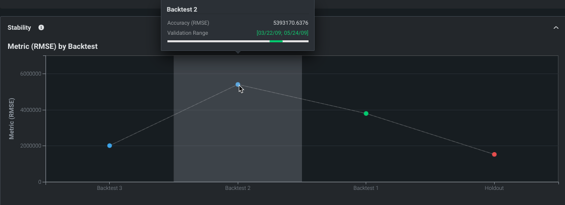 The Stability tab helps to measure performance and gives an indication of how long a model can be in production (how long it is "stable") before needing retraining. The values in the chart represent the validation scores for each backtest and the holdout.