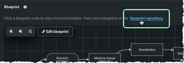The blueprint repository is a library of modeling blueprints available for a selected experiment. Blueprints illustrate the tasks (the preprocessing steps, selected estimators, and in some models, postprocessing as well) used to build a model, not the model itself. Model blueprints listed in the repository have not necessarily been built yet, but could be as they are of a type that is compatible with the experiment's data and settings.