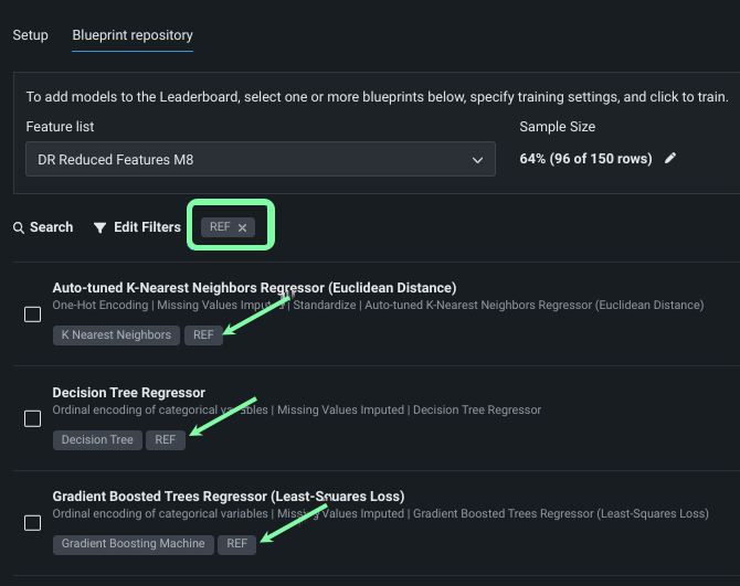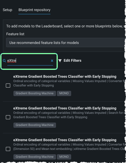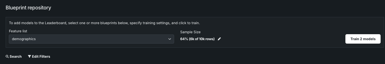 From the repository, select which blueprints to run and then set the model parameters. When selecting blueprints, you can use the search options to limit the list of models displayed.