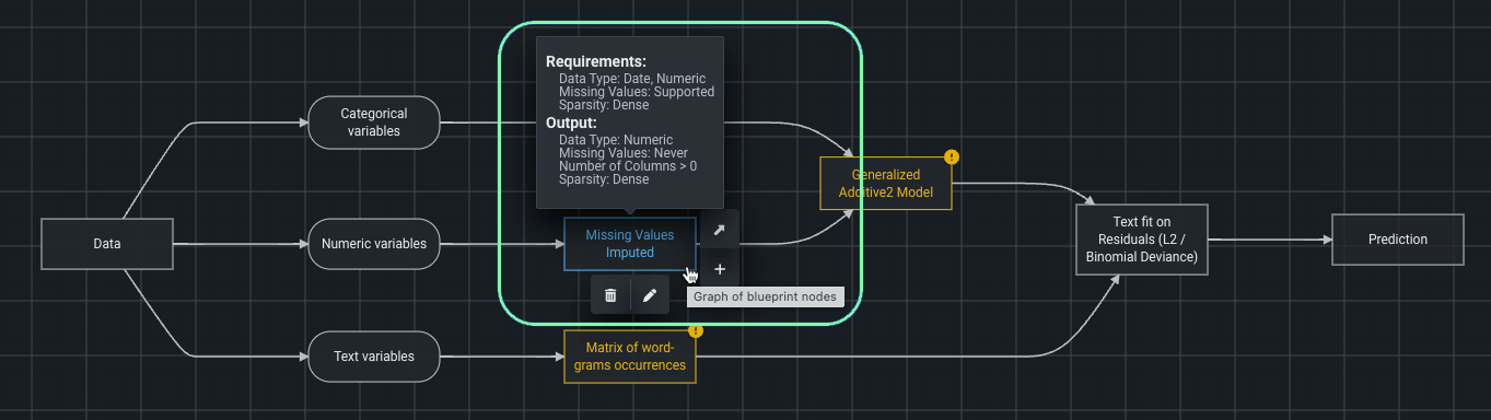 A blueprint represents the high-level end-to-end procedure for fitting the model, including any preprocessing steps, modeling, and post-processing steps. This section describes the blueprint editor, accessed from a model's Blueprint insight; see that tab for a detailed description of blueprint elements.
