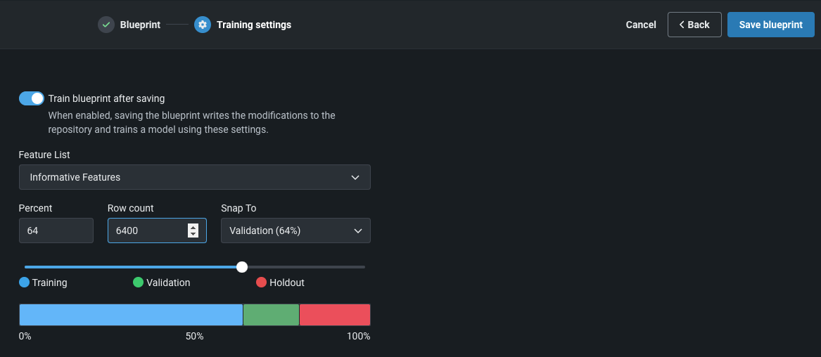When the modified blueprint has no errors, click Next to proceed to training settings. Either: