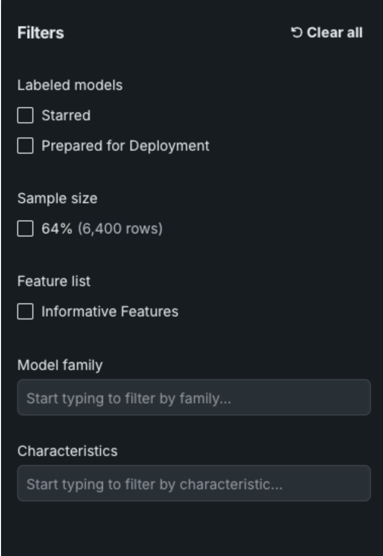 Filtering makes viewing and focusing on relevant models easier. Click Filter to set the criteria for the models that Workbench displays on the Leaderboard. The choices available for each filter are dependent on the experiment and/or model type—they were used in at least one Leaderboard model—and will potentially change as models are added to the experiment. For example: