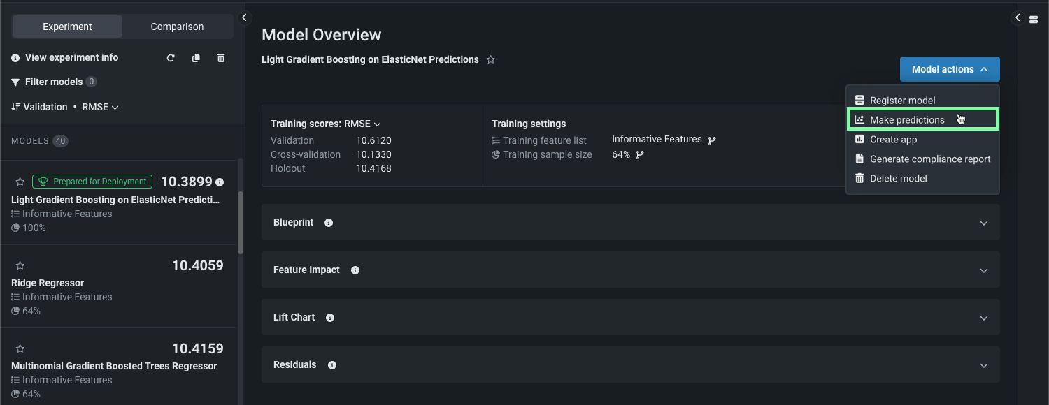 After you create an experiment and train models, you can make predictions on new data, registered data, or training data to validate those models.