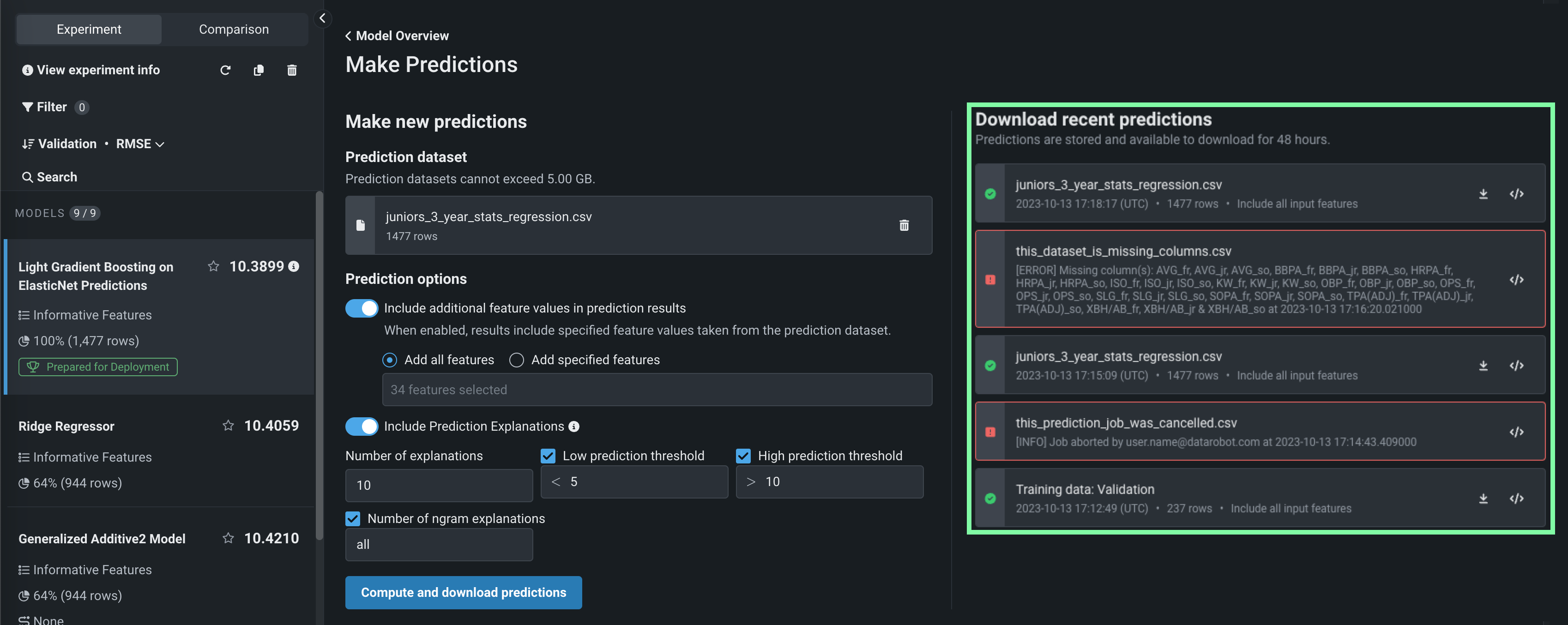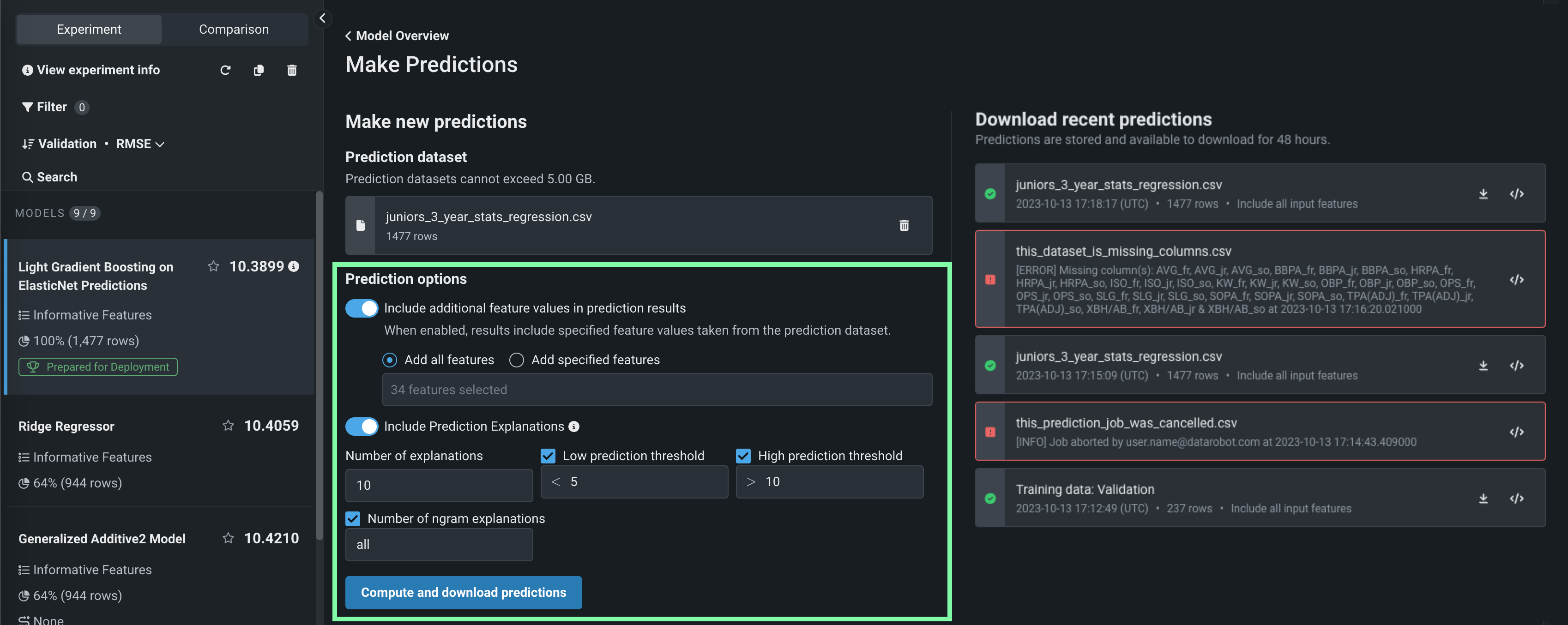 After you configure the Prediction options, click Compute and download predictions to start scoring the data, then view the scoring results under Download recent predictions: