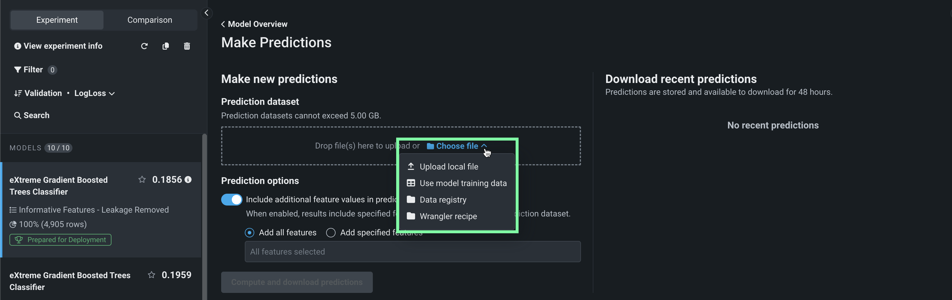 On the Make Predictions page, upload a Prediction source, drag a file into the Prediction dataset box, or click Choose file and select one of the following: