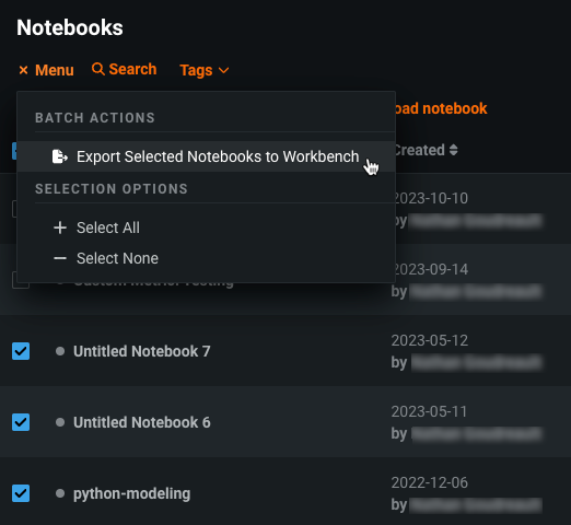 To export multiple notebooks, toggle the checkbox for each notebook you want to export, open the Menu, and click Export Selected Notebooks to Workbench.