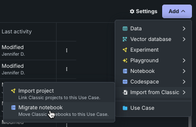 You can export notebooks in DataRobot Classic and add them to Use Case in Workbench. To migrate a DataRobot Classic notebook: