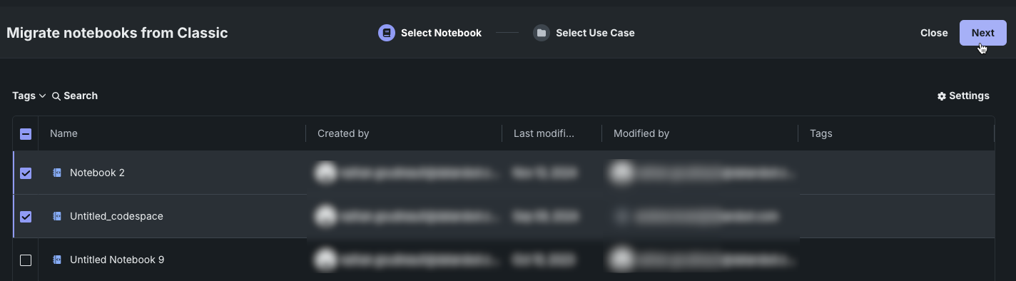 DataRobot lists your DataRobot Classic notebooks available to import. Toggle the checkbox for notebooks you want migrate, then click Next.