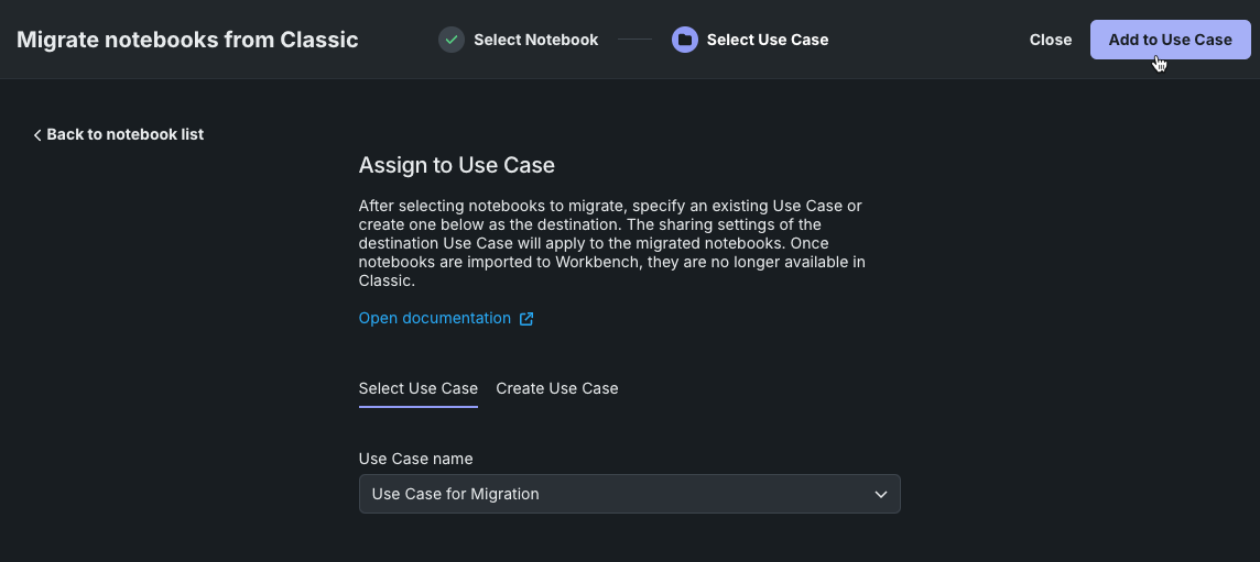 In the proceeding dialog box, choose the Use Case to migrate the notebook(s) to in Workbench. You can select an existing Use Case, or create a new one (for new Use Cases, you must provide a name and description). After selecting a Use Case, click Add to Use Case.