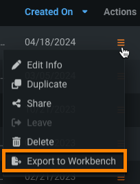 To export multiple projects, toggle the checkbox for each project you want to export, open the Menu, and click Export Selected Projects to Workbench.