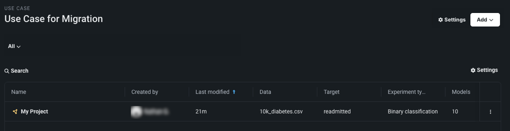 Click Add Experiment > Import from DataRobot Classic > Migrate notebook.