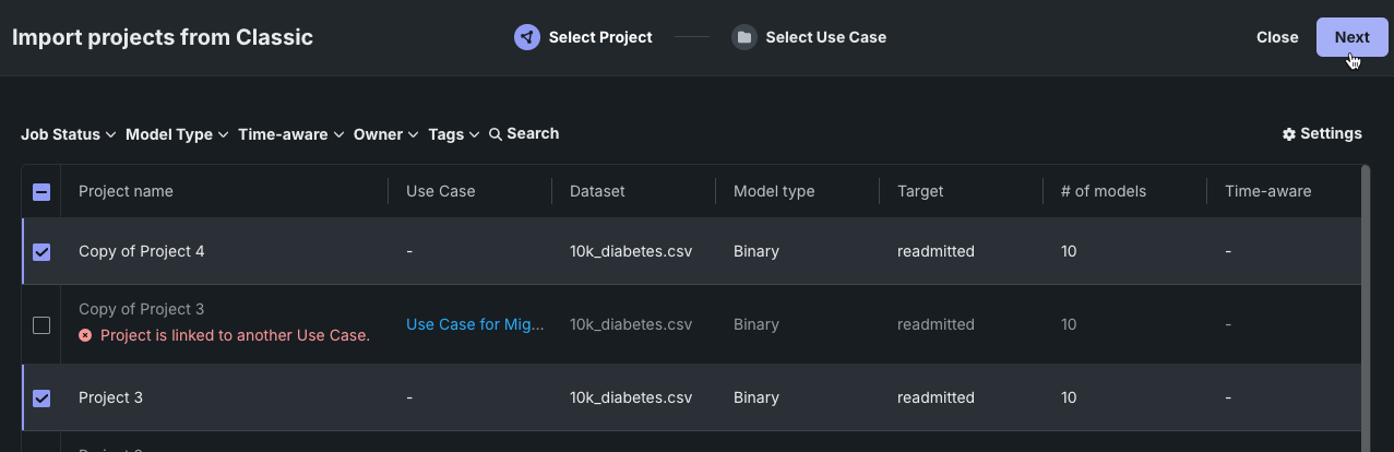 DataRobot lists your DataRobot Classic projects to import and indicates the projects ineligible for migration. Toggle the checkbox for projects you want to migrate, then click Next.