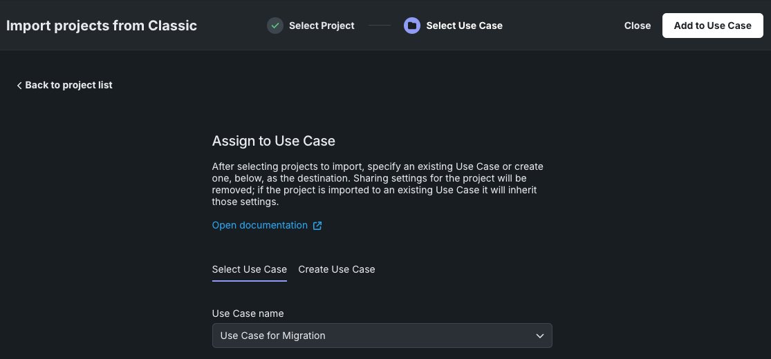 In the resulting dialog box, choose the Use Case to migrate the project(s) to in Workbench. You can select an existing Use Case or create a new one. (For new Use Cases, you must provide a name and description.) Note that the sharing settings for the project will be replaced by the Use Case's sharing settings. After selecting a Use Case, click Add to Use Case.