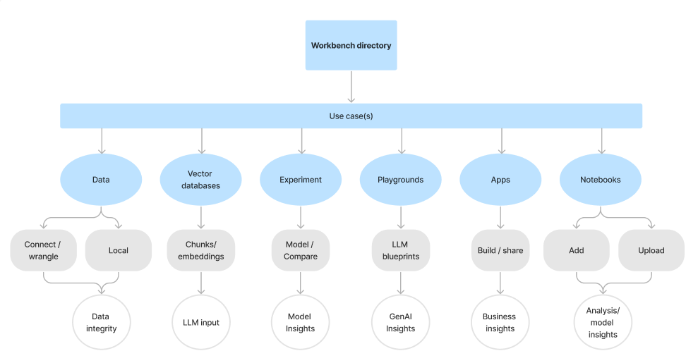 The following workflow shows different ways you can work with vector databases, playgrounds, and LLM blueprints when using generative modeling: