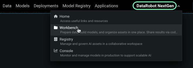 To get started with Workbench if you are in DataRobot Classic, click DataRobot NextGen in the top navigation bar of the DataRobot application and select Workbench.