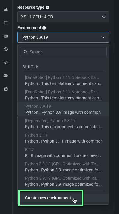 ) in the notebook sidebar and expand the Environment field dropdown. Scroll to the bottom of the list and select Create new environment. This brings you to the Environments page in Registry.