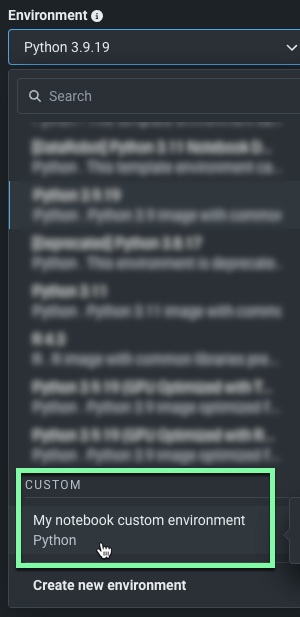 ) in the notebook sidebar and expand the Environment field dropdown again. This time, you can select the custom environment listed under the CUSTOM header in the dropdown list.