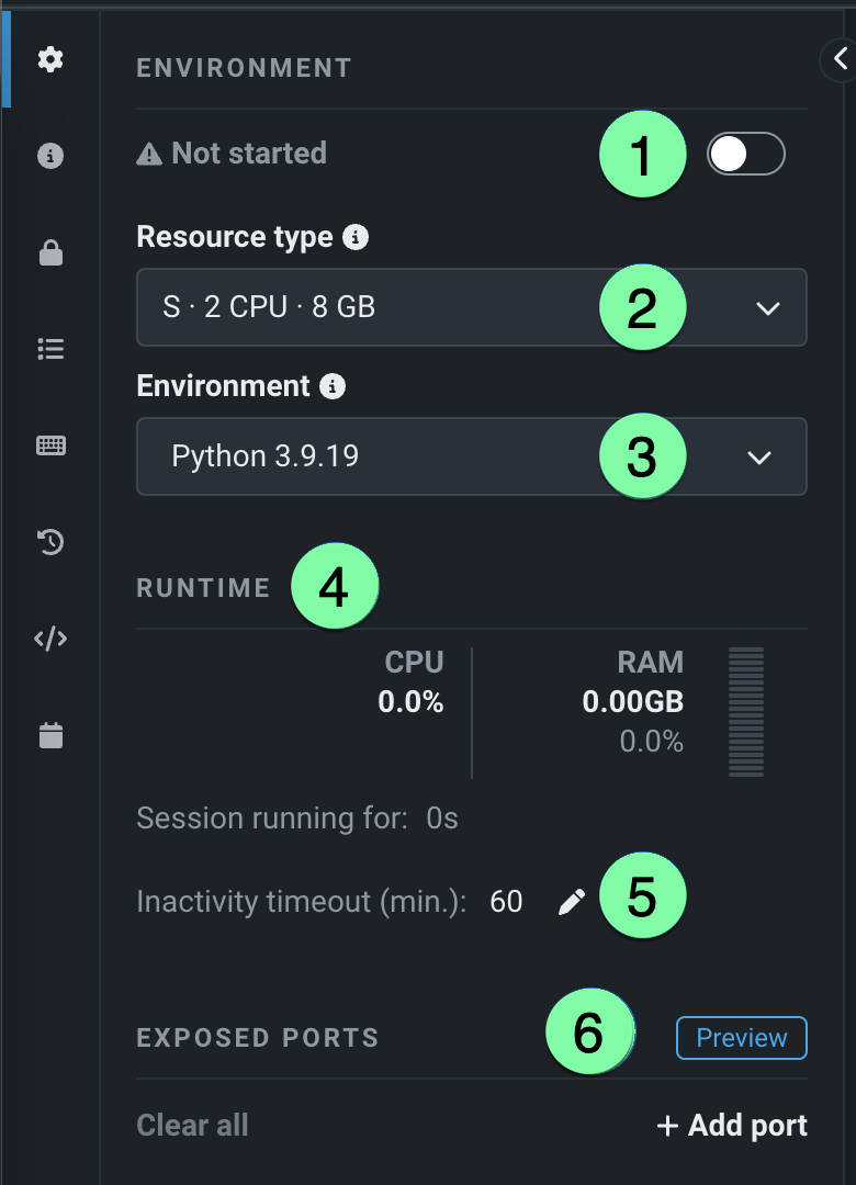 | 1 | Start environment toggle | Starts or stops the notebook environment's kernel, which allows you to execute the notebook's code cells. |