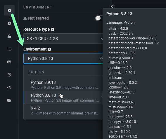 Before you create and execute code, click the environment icon to configure the notebook's environment. The environment image determines the coding language, dependencies, and open-source libraries used in the notebook. The default image for the DataRobot Notebooks is a pre-built Python image, but other options include GPU-optimized built-in environments. To see the list of all packages available in the default image, hover over that image in the Environment tab:
