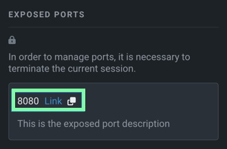 Once you have added the port to forward, you can start the container session for the notebook or codespace. After launching a web application, access the web application via the URL for the port listed in the Exposed ports list: