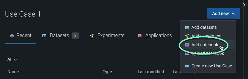 To add notebooks to a Use Case via Workbench, first select and navigate to the Use Case.
