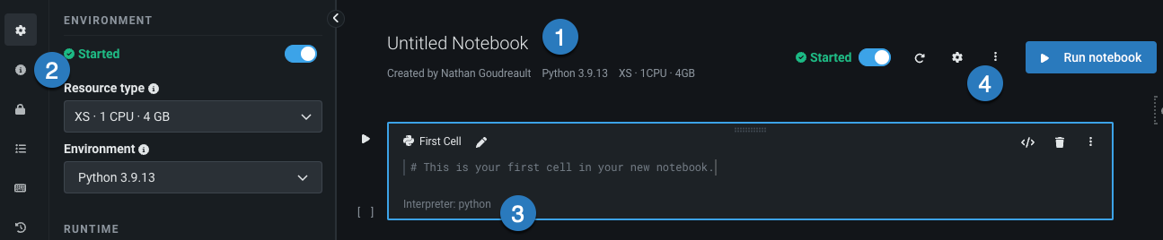 1 Notebook name The name of the notebook displayed at the top of the page and in the dashboard. Click on the pencil icon to rename it.